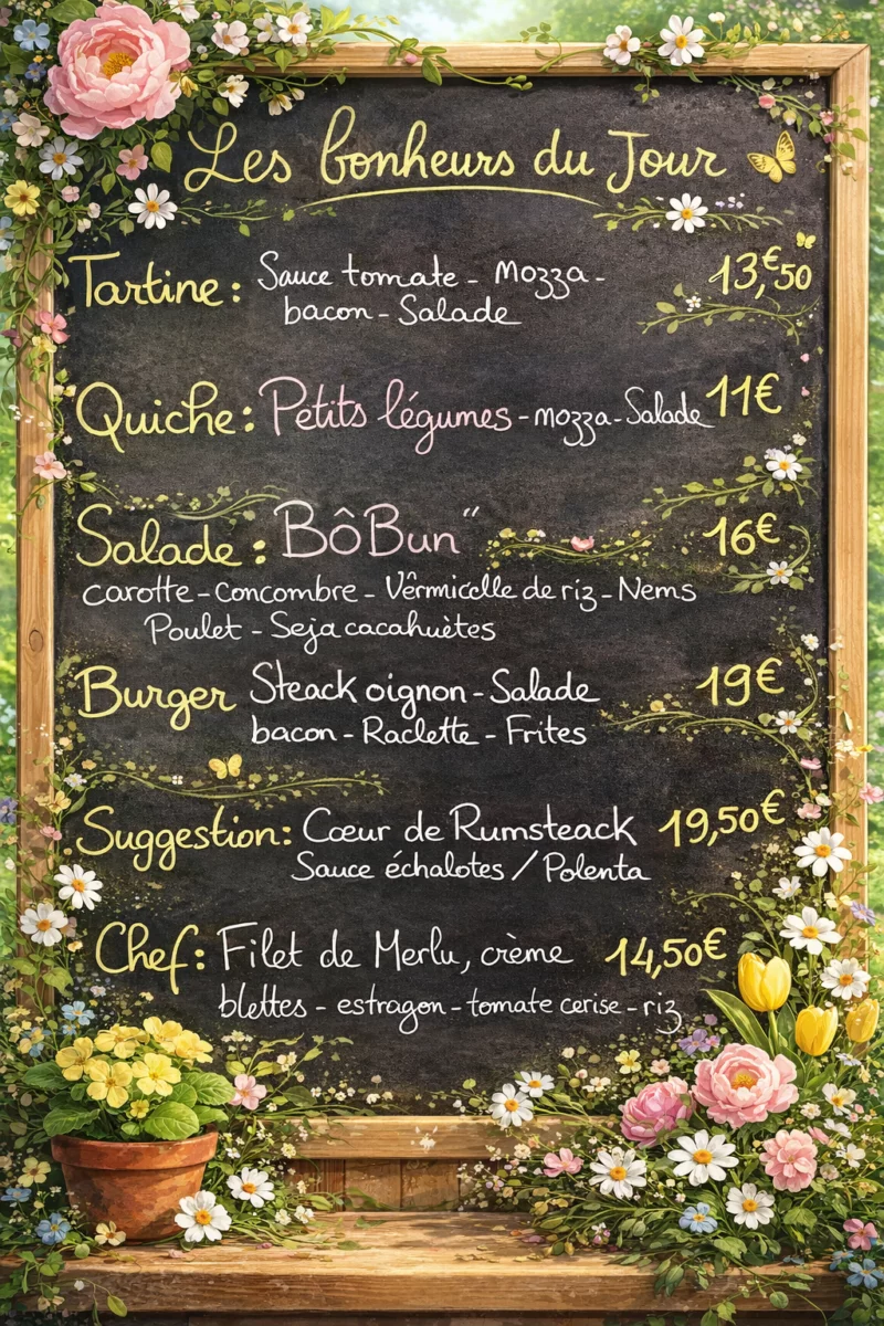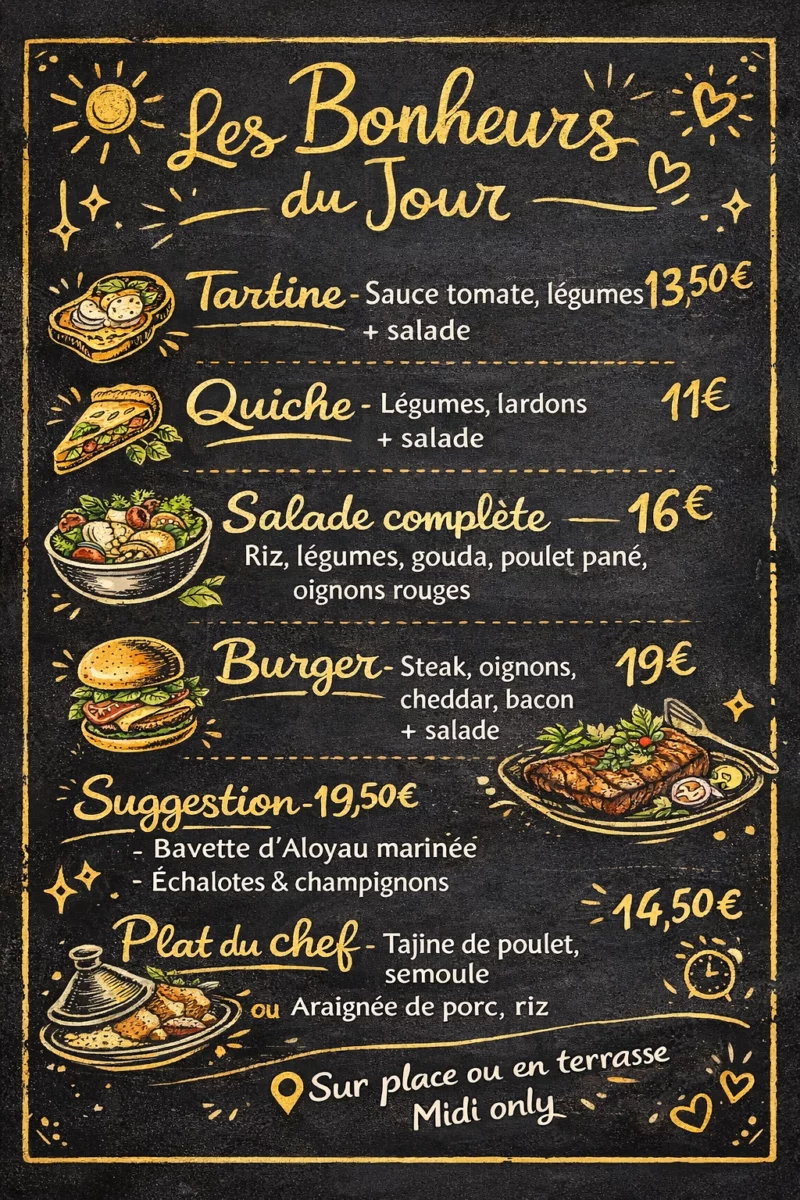 Le P’tits Bonheurs gourmand12,00 €Boisson chaude + Oeuf brouillé+ bacon ou jambon + Jus de fruit aux choix